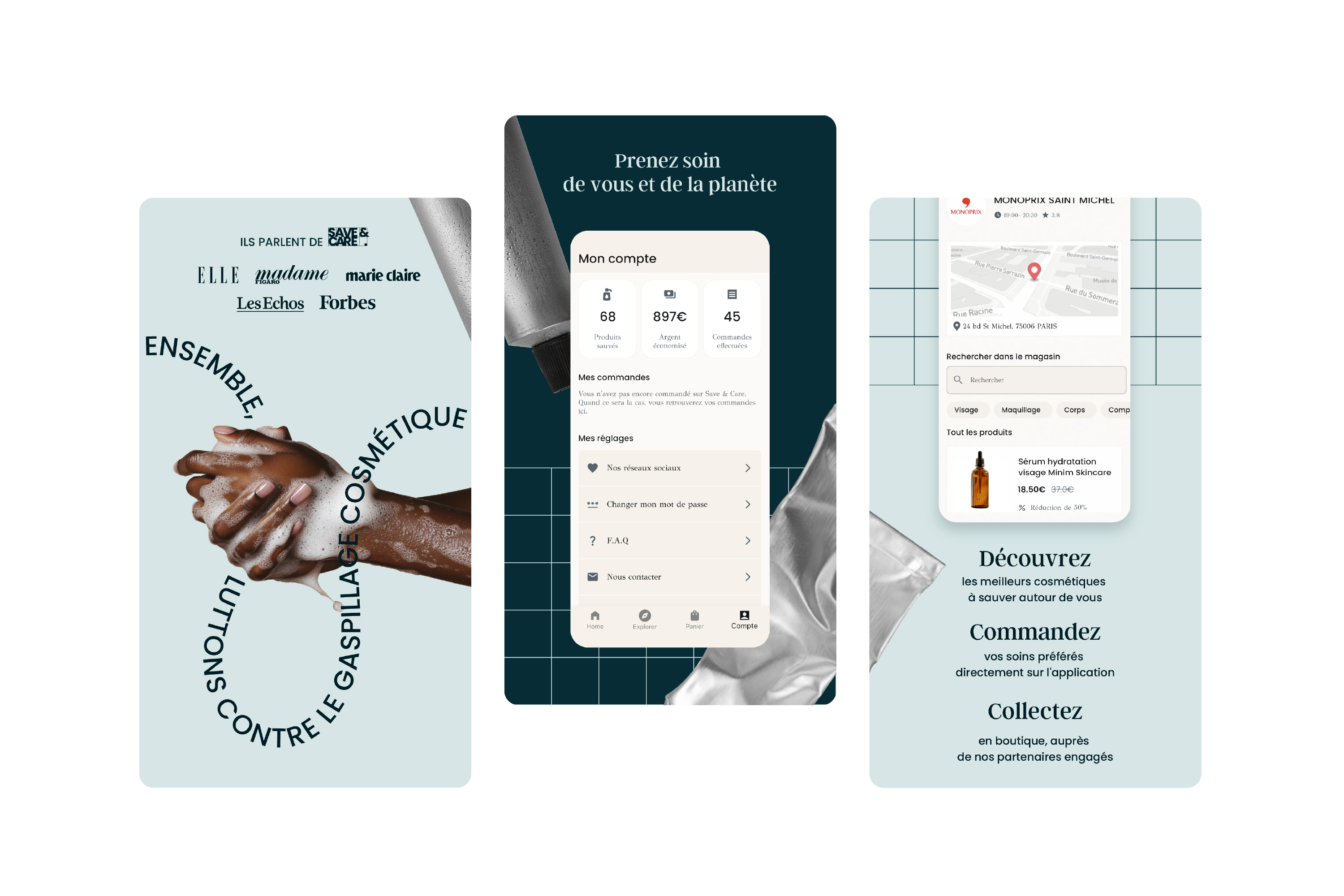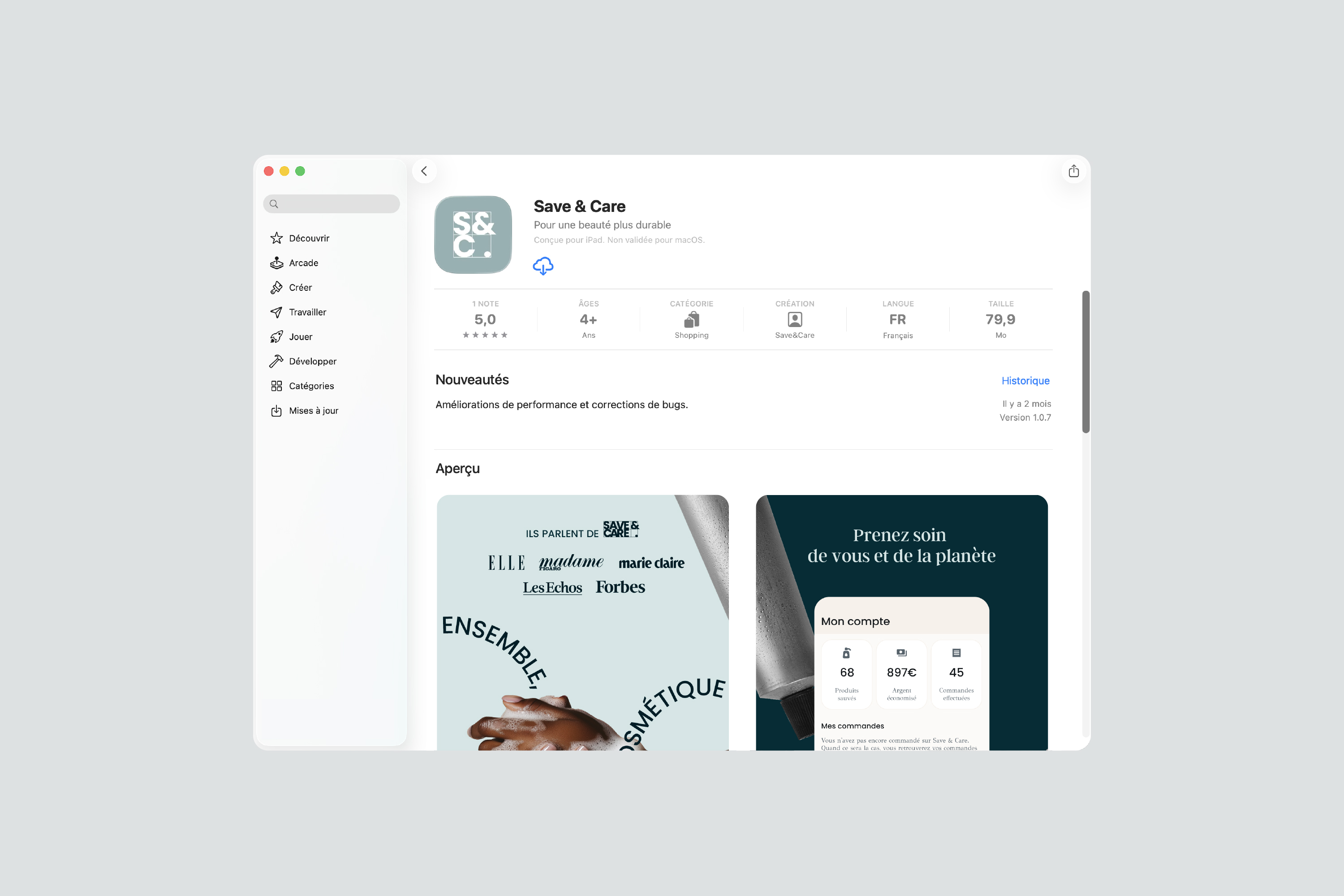 Save & Care est une startup française fondée en 2023, qui se positionne comme le Too Good To Go de la cosmétique. Sa mission : rendre les produits de beauté responsables plus accessibles, en proposant une marketplace où les utilisateurs peuvent acheter des cosmétiques neufs à prix réduits, issus de fins de séries ou de stocks invendus. L’objectif de l’équipe était de créer une expérience digitale cohérente et attrayante, à la fois sur mobile et sur web, afin de mieux faire connaître la marque et son engagement éco-responsable.
